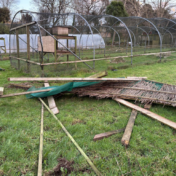 In the walled garden, the Tropical House had cracked glass, and roof panels which give shelter from rain on many aviaries had blown off.